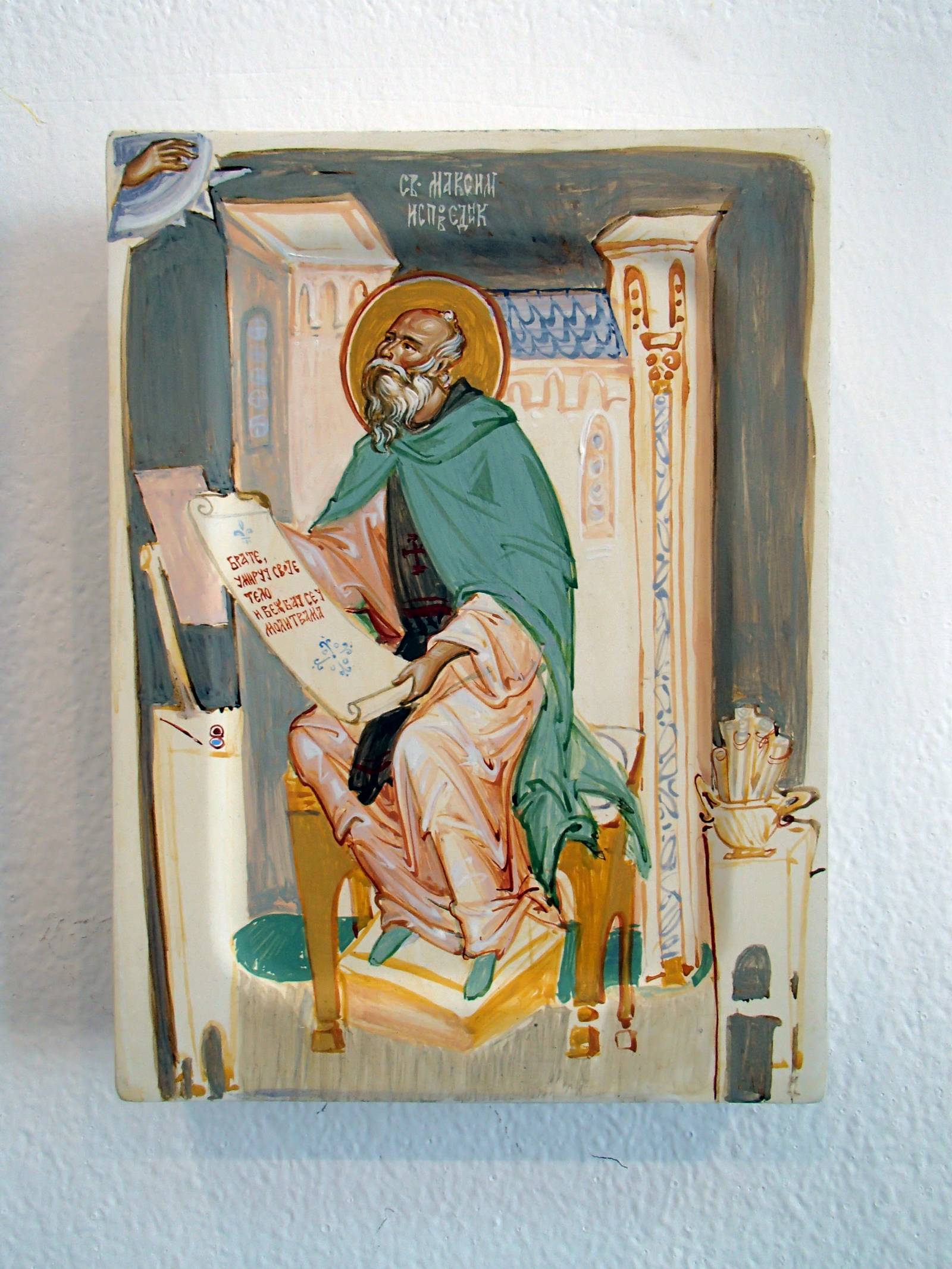 De même sont présentés des saints qui sont les auteurs des œuvres littéraires de théologie les plus importantes. Sur les suites, il y a des textes avec le plus souvent des messages évangéliques qui souhaitent établir une communication avec l’observateur. Le but était de souligner le contexte de l’art et de la pensée chrétiens, mais aussi d’indiquer le rôle social actif de l’icône en tant qu’œuvre d’art qui sort de la sphère du passif et de l’exclusivement esthétique et c’est la raison du nom « Omélies en couleurs » que porte l’exposition.