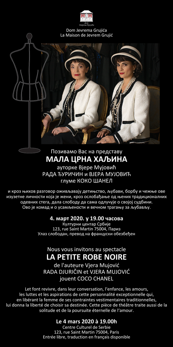 Дом Јеврема Грујића, музеј историје, уметности и дипломатије под покровитељством Министарства културе и информисања Републике Србије, представља представу: „Две жене и један рат“ у Културном центру Србије у Паризу.