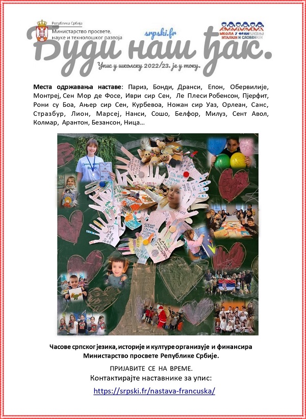 Упис ученика у српску допунску школу за школску 2022/23. годину Први део уписа у школску 2022/23. у свим одељењима допунске наставе на српском језику у иностранству почиње 2. маја 2022. године. Све информације о местима и терминима одржавања наставе са контактима наставника који изводе образовно-васпитни рад налазе се на школској интернет страници https://srpski.fr/. Пријаве за упис ученика могу се преузети са школске интернет странице. За сва додатна питања можете контактирати наставнике на: https://srpski.fr/nastava-francuska/ |