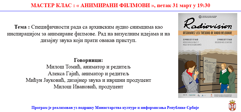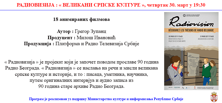 У уторак 18. априла у 20 часова у Културном центру Србије погледајте са нама две епизоде „Дестинација Франкофонија“ снимљене у Србији, у присуству водитеља Ивана Кабакофа! „Дестинација Франкофонија“ је недељни програм који се емитује на TV5 Monde. У свакој земљи, Иван Кабакоф иде у сусрет са говорницима француског који нам, на француском, представљају своју културу и стил живота. Емисија такође промовише пројекте који оживљавају француски језик на локалном нивоу, жив, динамичан језик који се стално развија. Прва епизода у Београду истражује трагове историјског пријатељства Француске и Србије кроз посету амбасаде Француске, основне школе Рибникар и француске катедре Универзитета у Београду. Крај програма посвећен је Новом Саду. Друга епизода у Нишу је прилика да се открије Музеј џеза, затим Ћеле-Кула, симбол отпора Срба. У програму се говори и о археолошком локалитету: Царичин град или Јустинијана Прима, град римског цара ЈустинијанаI, чији су остаци пронађени код Ниша. Обе епизоде ће бити титловане на српски језик. Реализација програма је омогућена захваљујући помоћи Министарства туризма Србије, Министарства спољних послова Србије, Амбасаде Француске и Француских института у Нишу и Новом Саду. ПРОШЛИ ДОГАЂАЈИПројекција српских филмова у оквиру фестивала „Европа око Европе“