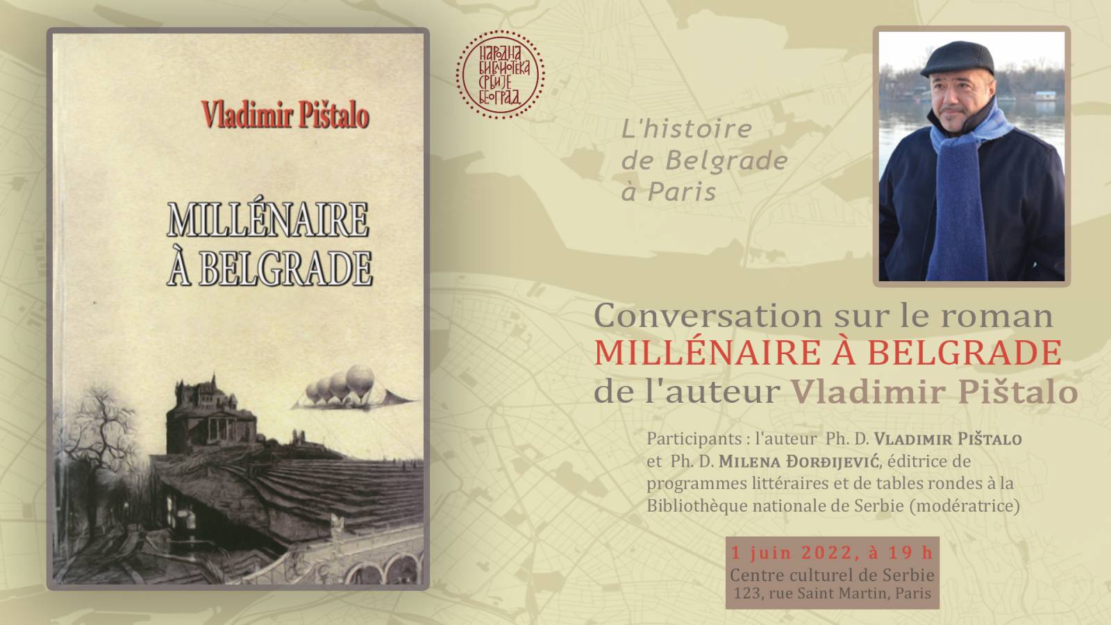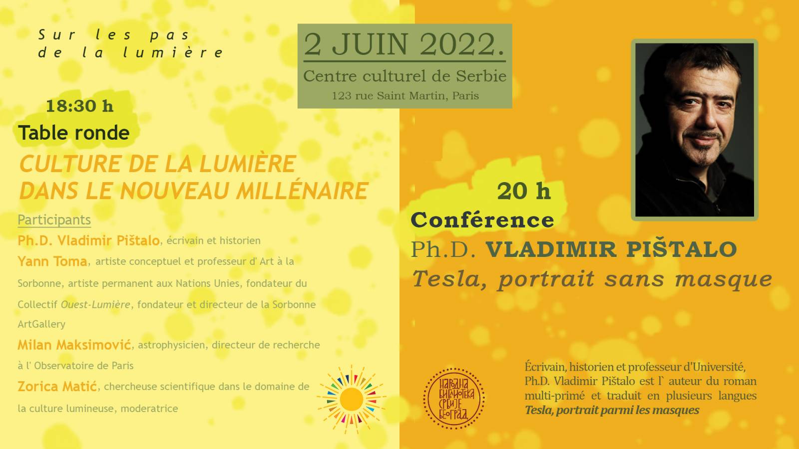 У Културном центру Србије у Паризу током 1. и 2. јуна 2022. године Народна библиотека Србије одржаће три програма: 1. Прича о Београду у Паризу – Разговор о роману Миленијум у Београду Владимира Пиштала. Датум: 1. јун, у 19 сати. Учествују: књижевник Владимир Пиштало и Милена Ђорђијевић, уредница књижевних и трибинских програма у Народној библиотеци Србије (модераторка). Књижевник Владимир Пиштало, један од најистакнутијих и најпревођенијих савремених српских писаца, говориће о разноликим темама у роману Миленијум у Београду, објављеном и на француском: души Београда, крају миленијума, усамљеним поштеним појединцима и немогућим љубавима. Миленијум у Београду нашао се у најужем избору за награду „Фемина“, за преведене стране романе на француски, и имао је одличну рецепцију у Француској. Програм, са обезбеђеним преводом на француски, траје 60 минута, уз предвиђени десетоминутни разговор са публиком и коктел. 2. Стопама светлости Трибина: Култура светлости у новом миленијуму Датум: 2. јун, у 18.30. Учесници: др Владимир Пиштало, књижевник и историчар; Јан Тома (Yann Toma), концептуални уметник и професор уметности на Сорбони, уметник – стални посматрач при Уједињеним нацијама, оснивач колектива Запад-Светлост (Ouest-Lumière), оснивач и директор уметничке галерије на Сорбони (Sorbonne ArtGallery); Милан Максимовић, астрофизичар, директор истраживања у Париској опсерваторији; Зорица Матић, научни истраживач на пољу културе светлости, модератор. Трибина траје 70 минута, са обезбеђеним преводом. Предавање Владимира Пиштала – Тесла, портрет без маске Датум: 2. јун, у 20 сати. Књижевник, историчар и универзитетски професор др Владимир Пиштало, аутор вишеструко награђиваног и једног од најпревођенијих српских романа Тесла, портрет међу маскама, одржаће предавање „Тесла, портрет без маске“ Предавање, са обезбеђеним преводом на француски, траје 30 минута, уз предвиђену десетоминутну дискусију и коктел. Четвртак, 26. мај 2022. у 19 часова - Округли сто: „Дворци Србије: заштита културног наслеђа“